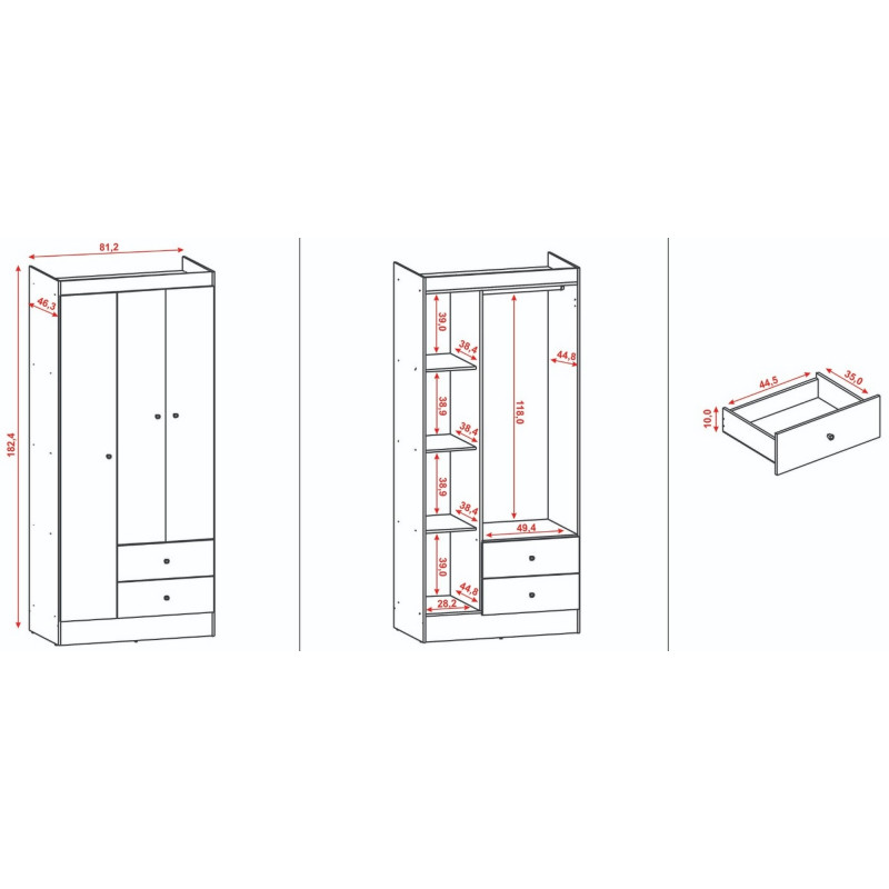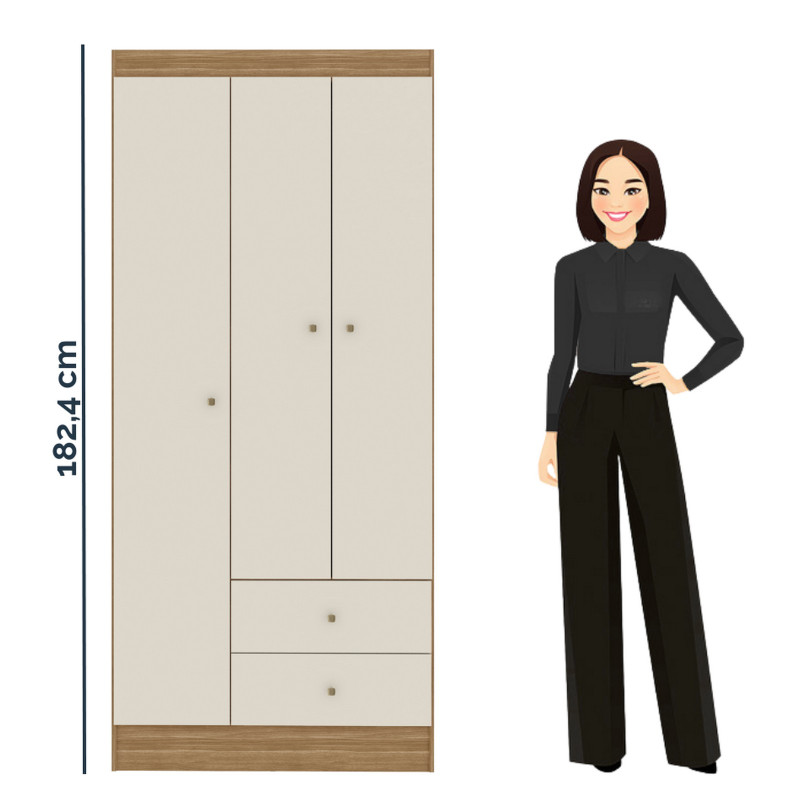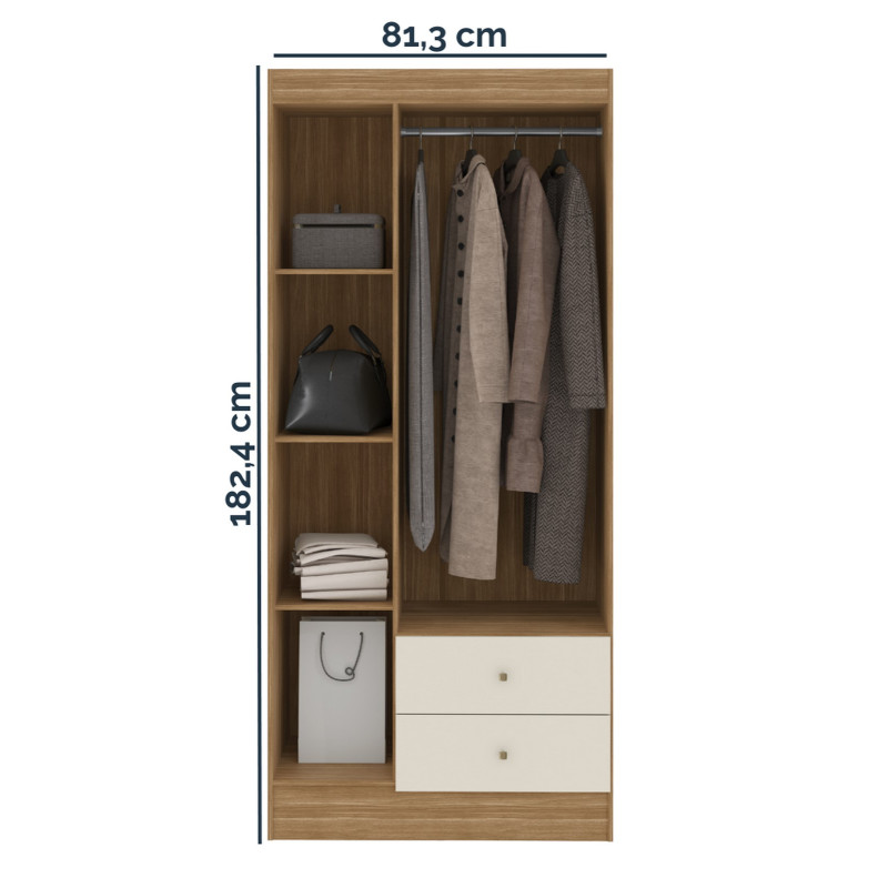 Armoire Penderie. 3 Portes et 2 Tiroirs. Modèle VERSA. Coloris Imitation Chêne + Blanc Crème. Longueur 81.2 cm Hauteur 182.4 cm Profondeur 46.3 cm. 4 Etagères + 1 Penderie. 5 Niches. Livraison gratuite sous une semaine.