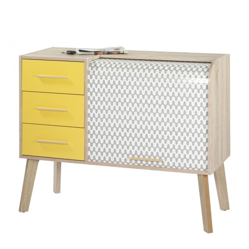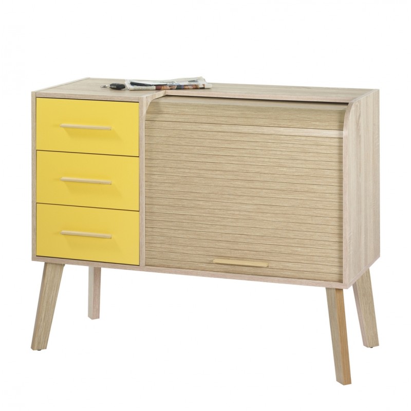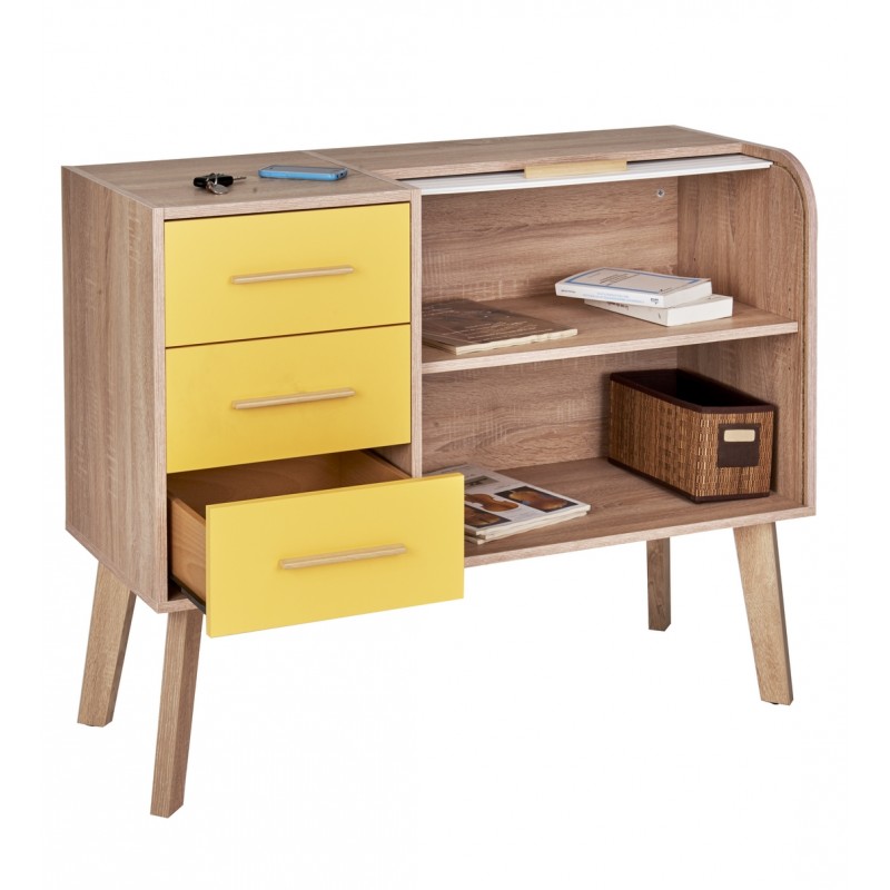 Meuble d'Entrée Chêne 3 Tiroirs Jaunes. Coloris du rideau : blanc, chêne ou vagues. Largeur 110 cm Hauteur 87.9 cm Profondeur 44 cm. 1 Tablette réglable. Fabriqué en France. Eco-conçu. Livraison gratuite sous une semaine.