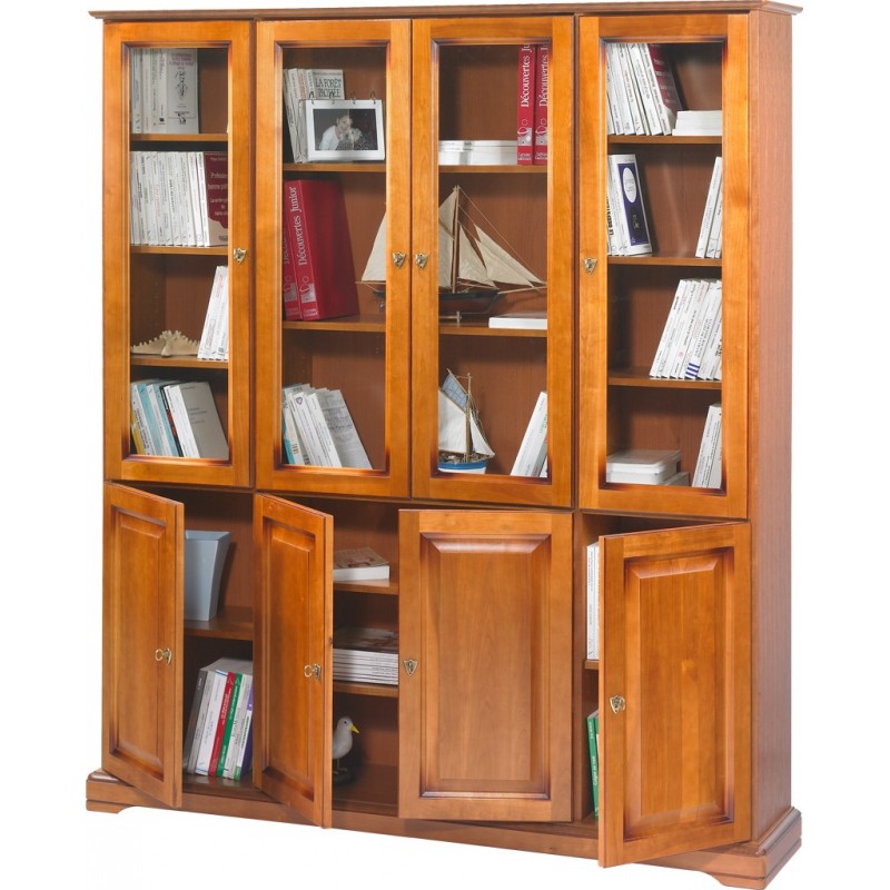 Grande Bibliothèque 8 Portes. Plaquée Merisier, Style Louis-Philippe. Largeur 158.8 cm Hauteur 182.2 cm Profondeur 33 cm. Portes et socle en Aulne Massif Teinté Merisier. 18 Niches - 15 étagères. Livraison sous une semaine offerte.