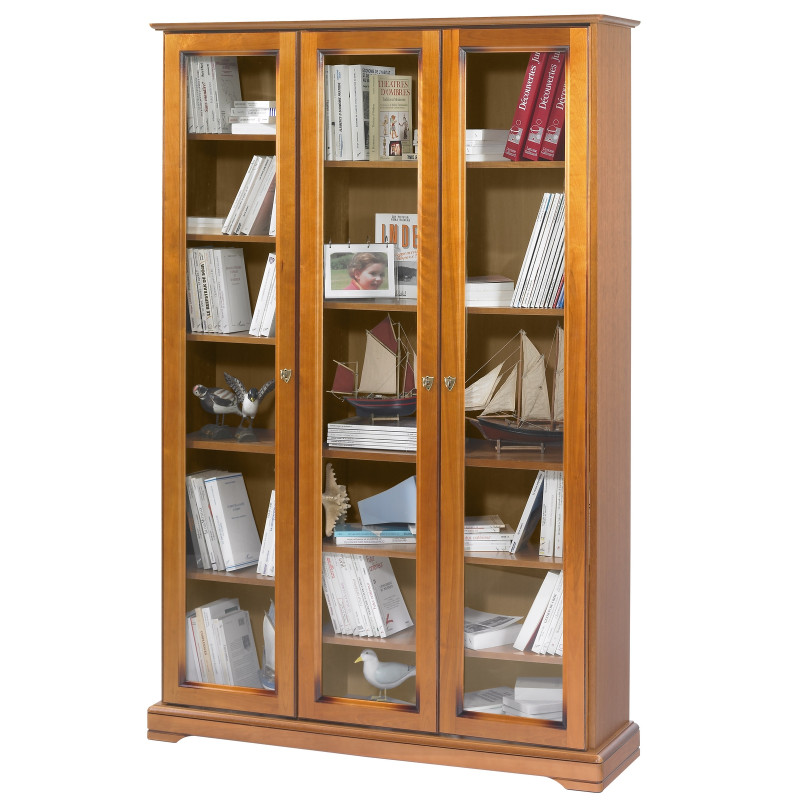 Bibliothèque 3 Grandes Portes Vitrées. 10 Etagères - 12 Niches. Largeur 120.6 cm Hauteur 182.2 cm Profondeur 33 cm. Plaquée Merisier, Style Louis Philippe. Portes et socle en Aulne Massif Teinté Merisier. Livraison sous une semaine offerte.
