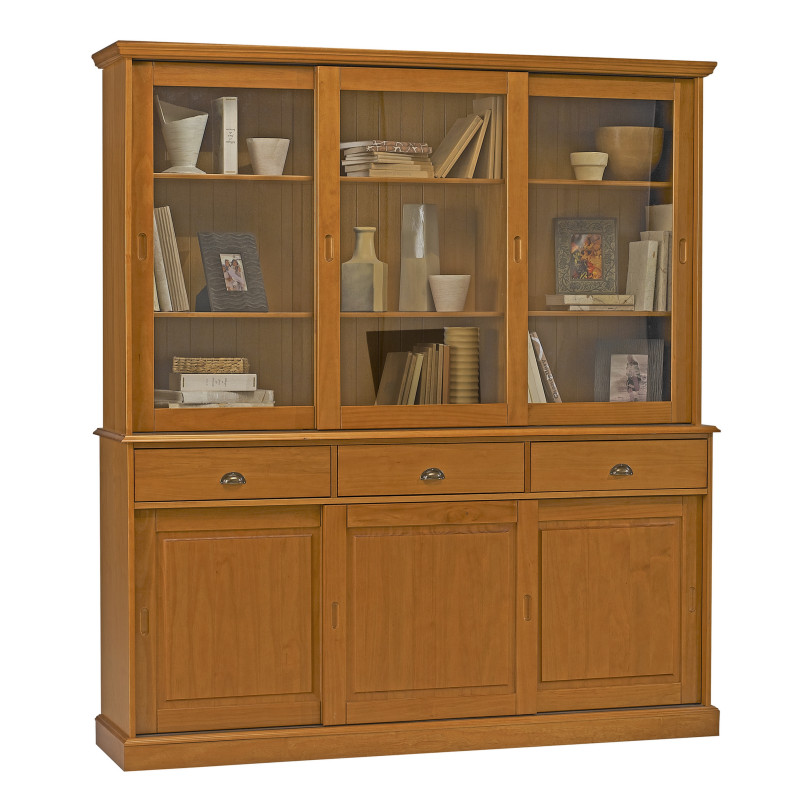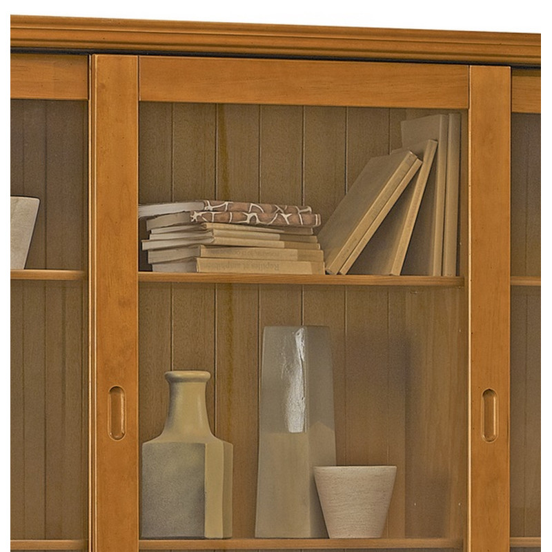 Bibliothèque - Vaisselier. Pin Miel. 6 Portes Coulissantes (dont 3 Vitrées) + 3 Tiroirs. Largeur 178.6 cm Hauteur 199 cm Profondeur 42.3 cm. Style Anglais Charme. 6 tablettes réglables. 10 Niches. Livraison sous une semaine offerte.