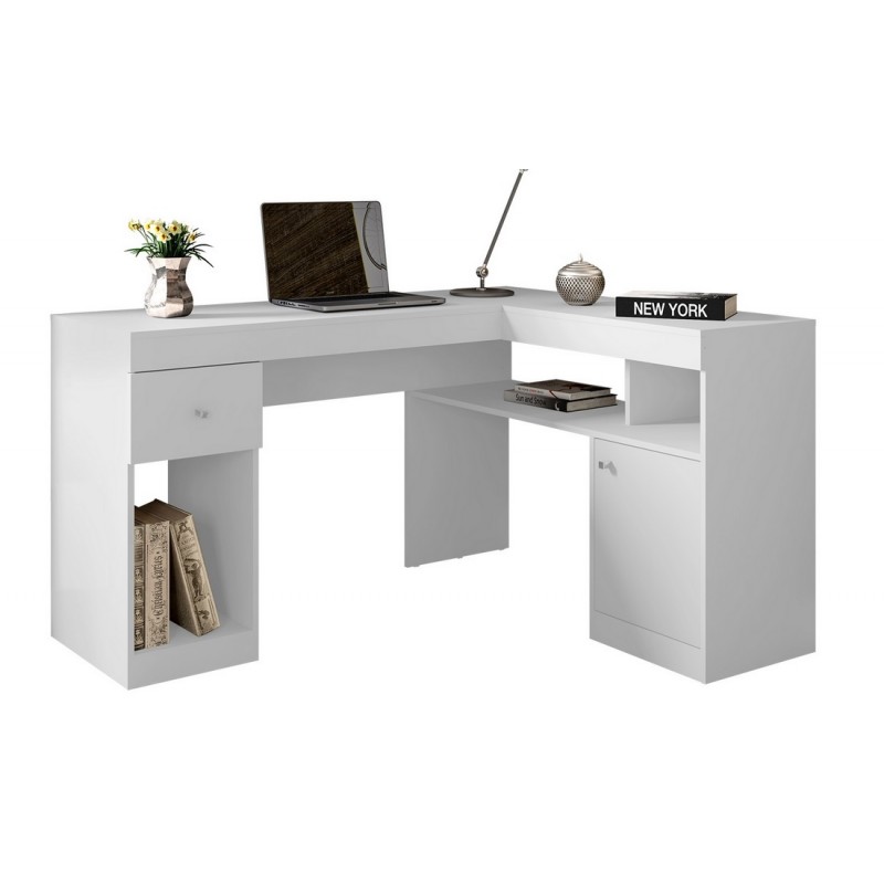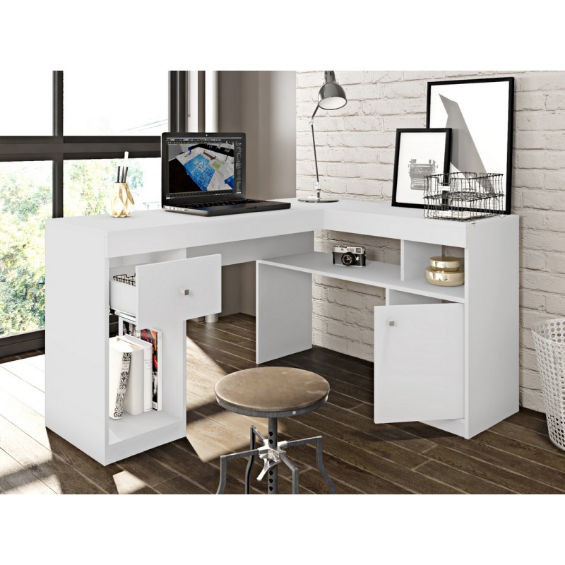 Bureau d'angle + 1 Caisson 1 Tiroir + 1 Retour de Bureau avec 1 Meuble de Rangement 1 Porte. Coloris Blanc. Longueur au mur 137.2 cm Hauteur 75.5 cm Profondeur 111.6 cm. 4 Niches. Livraison sous une semaine offerte.