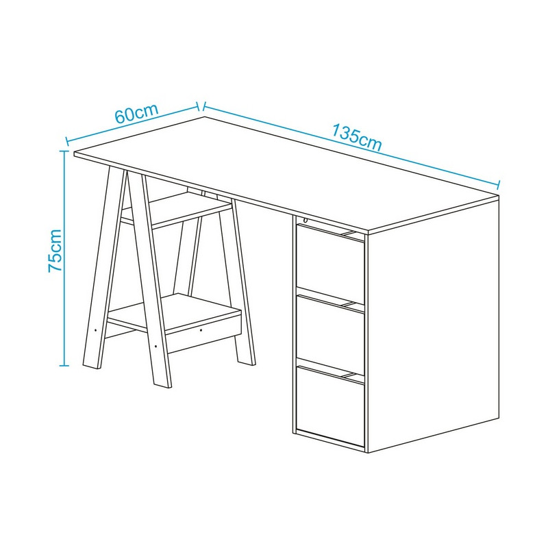 - Plateau de bureau : Largeur 135 cm x Hauteur 75 cm x Profondeur 60 cm