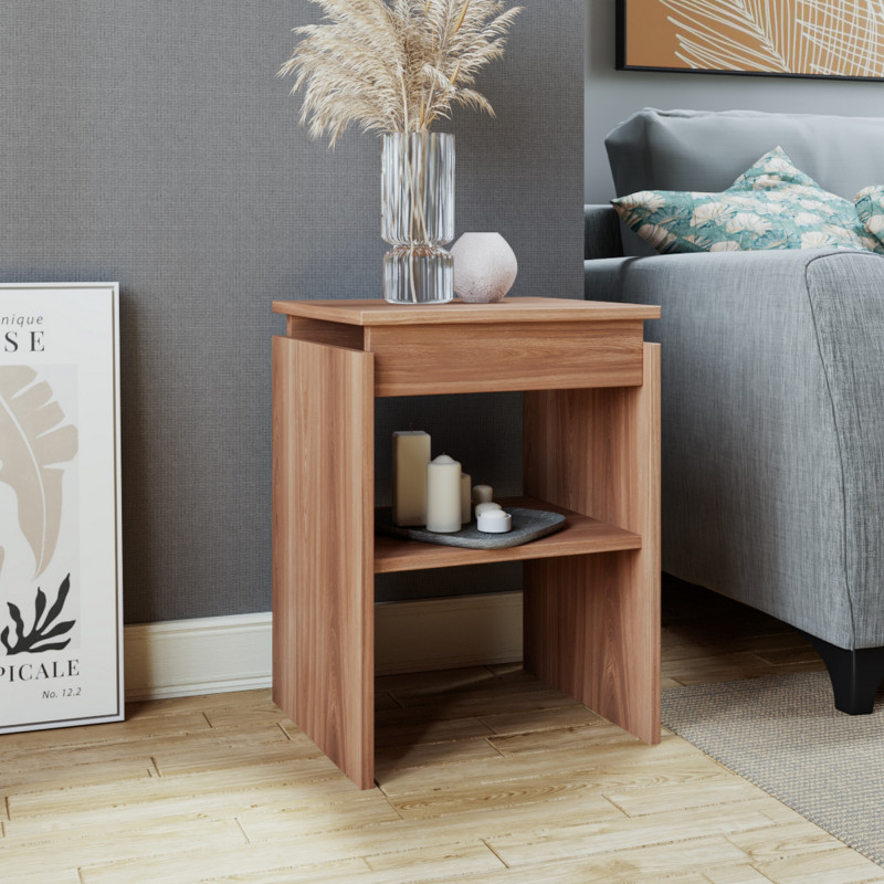 Meuble Bout de Canapé - Chevet Imitation Châtaignier gamme FLOAT. Egalement Meuble d'Entrée. 2 Niches. Largeur 38 cm Hauteur 52 cm Profondeur 33 cm. Livraison sous 5 jours offerte.