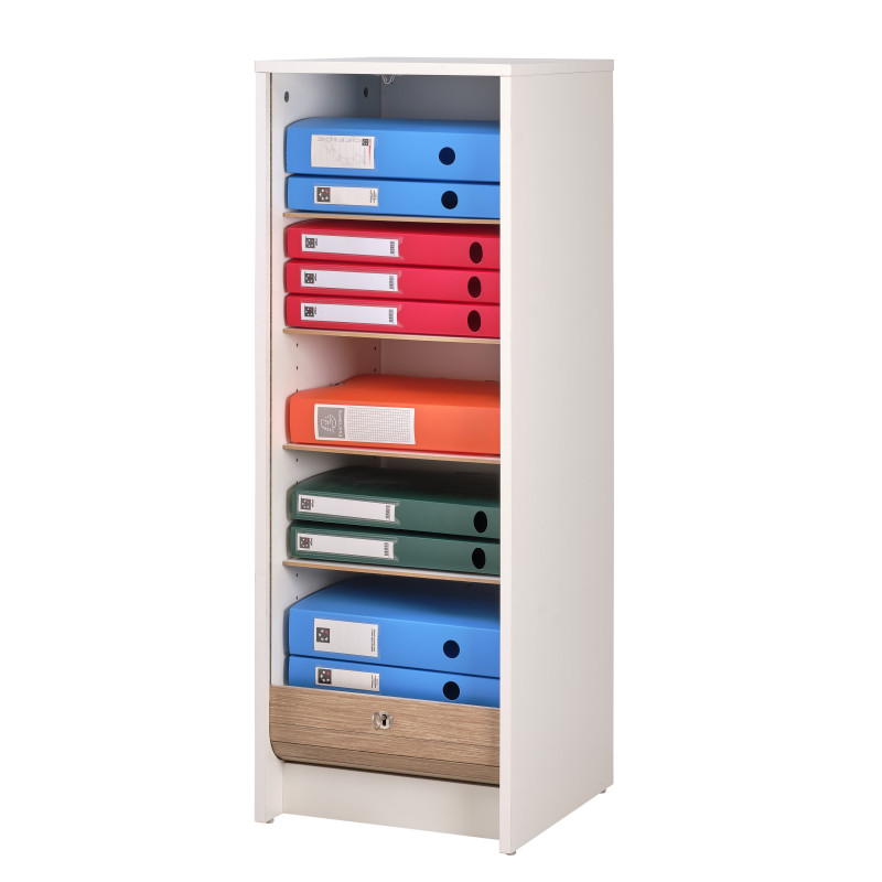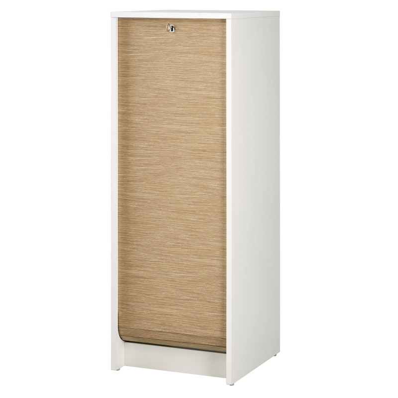 Classeur à Rideau Blanc. Rideau Chêne ou Noir. Hauteur 104 cm. 5 Etagères. Largeur 37.8 cm Hauteur 103.8 cm Profondeur 38.4 cm. Fermeture à clé. Fabriqué en France. Eco-conçu. Livraison sous 7 jours offerte.