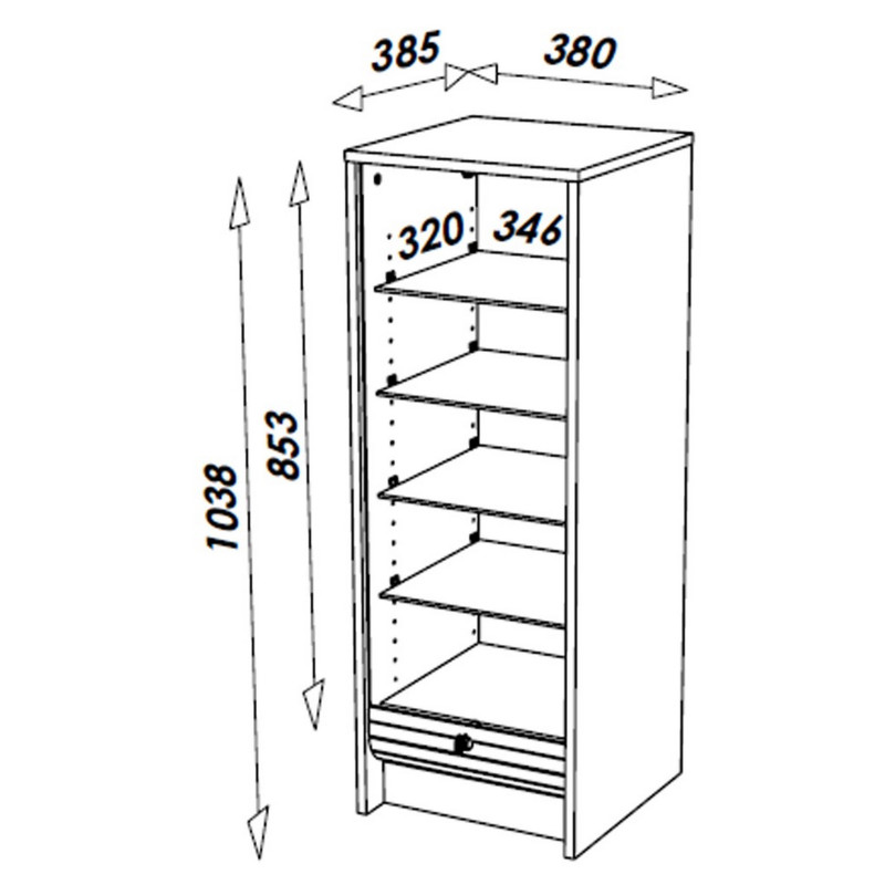 - Côtés, dessus, dessous et tablette fixe en panneaux de particules de bois mélaminés (2 faces) qualité E1.
