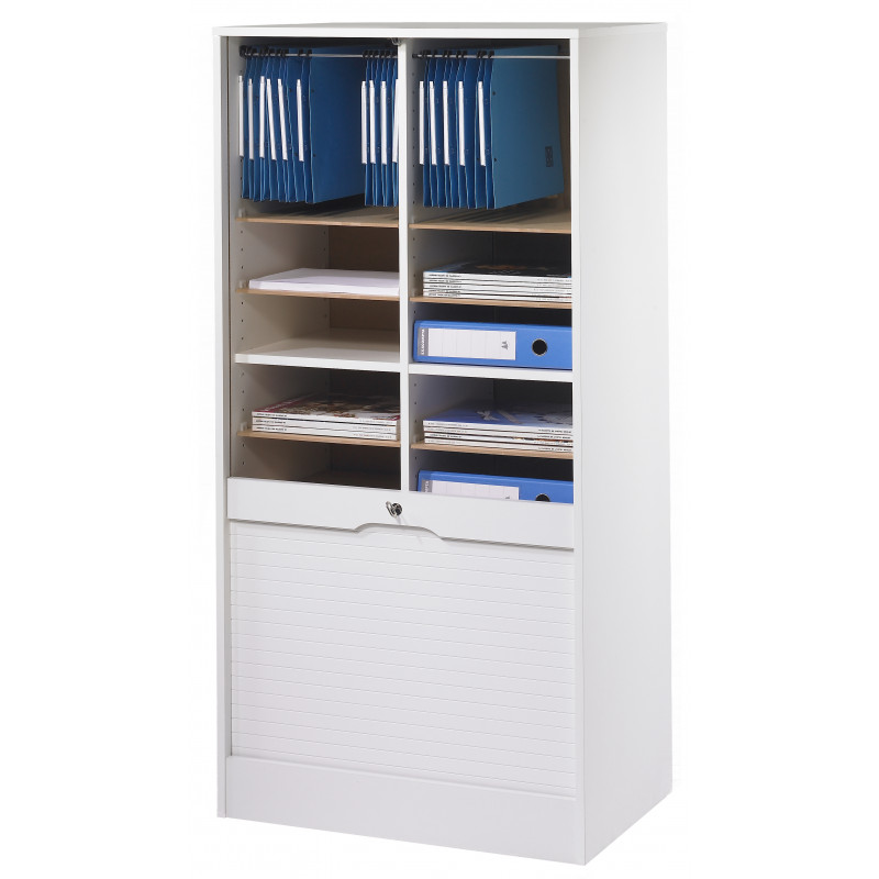 Classeur à Rideau. Largeur 70 cm Hauteur 140 cm Profondeur 44 cm. Coloris disponibles : Blanc, Hêtre et Merisier. 16 Etagères. 2 Kits pour dossiers suspendus. Fermeture à clé. Fabriqué en France. Eco-conçu. Livraison sous 7 jours offerte.