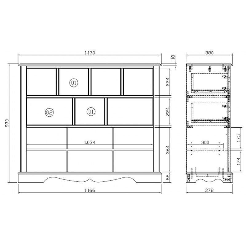- Structure MDF (panneaux de fibres de bois) teinté blanc, protection vernis nitrocellulosique.