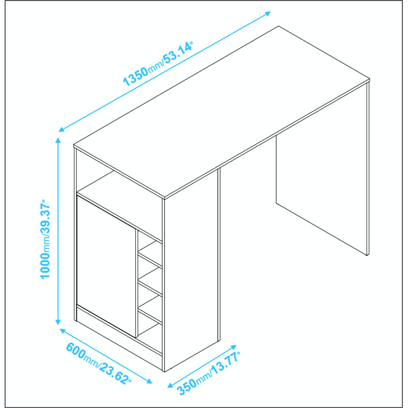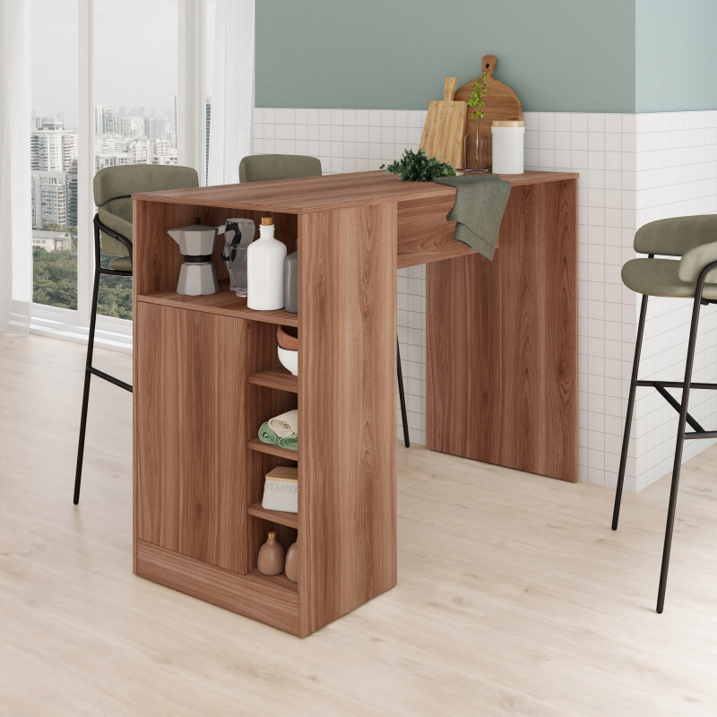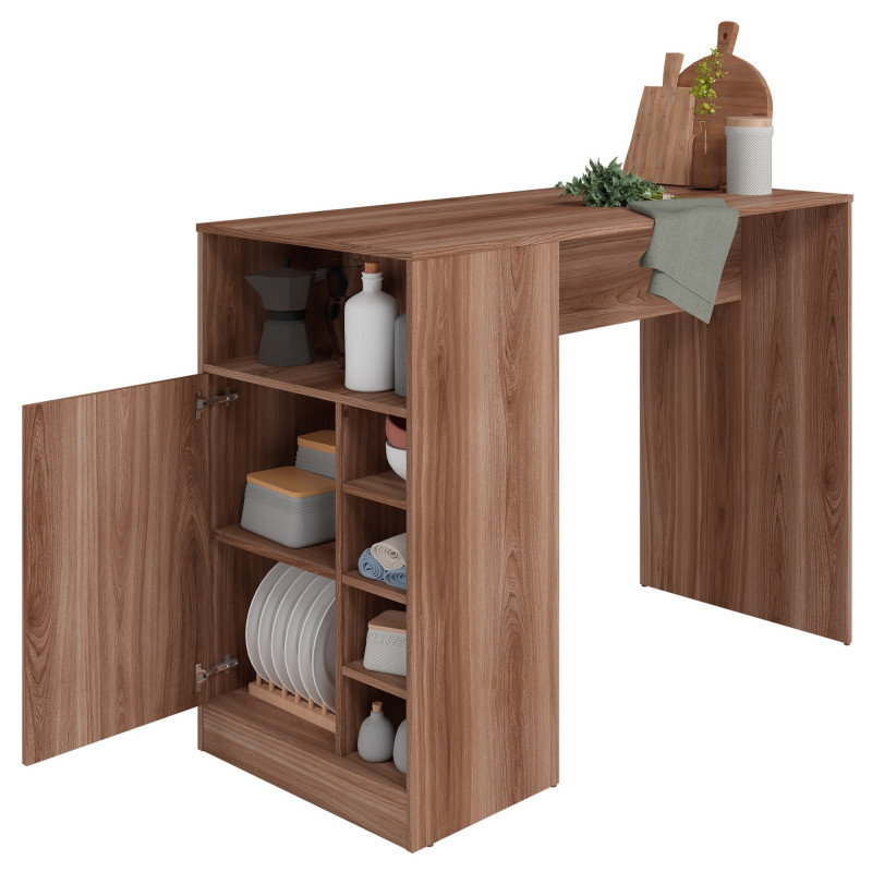 Comptoir de Cuisine - Table à Manger pour 2 Personnes. 1 Porte. 7 Niches. Longueur 135 cm Hauteur 100 cm Profondeur 60 cm. Peut être mis contre de le mur dans le sens de la largeur ou de la longueur. Coloris Imitation Châtaignier. Livraison sous une semaine offerte.