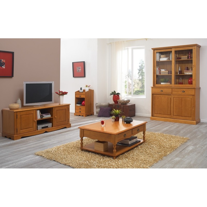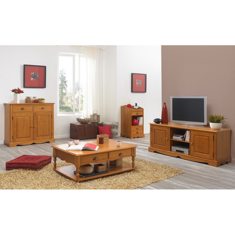 - Structure en pin massif panneauté, replaqué pin et teinté miel. (Cette technique de fabrication évite aux panneaux pin massif de se déformer)