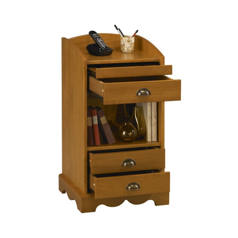Meuble Box - Meuble Téléphone - Meuble d'entrée - Table de Chevet. Pin Miel. 3 Tiroirs - 1 Niche - 1 Tirette. Largeur 47 cm Hauteur 82 cm Profondeur 42.5 cm. Livraison sous une semaine offerte.