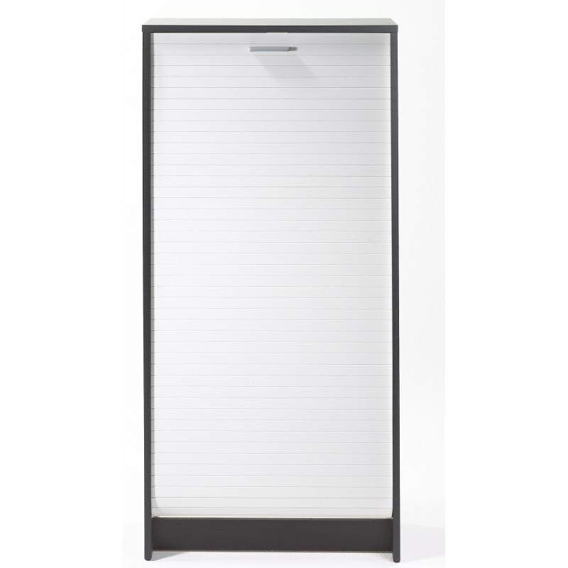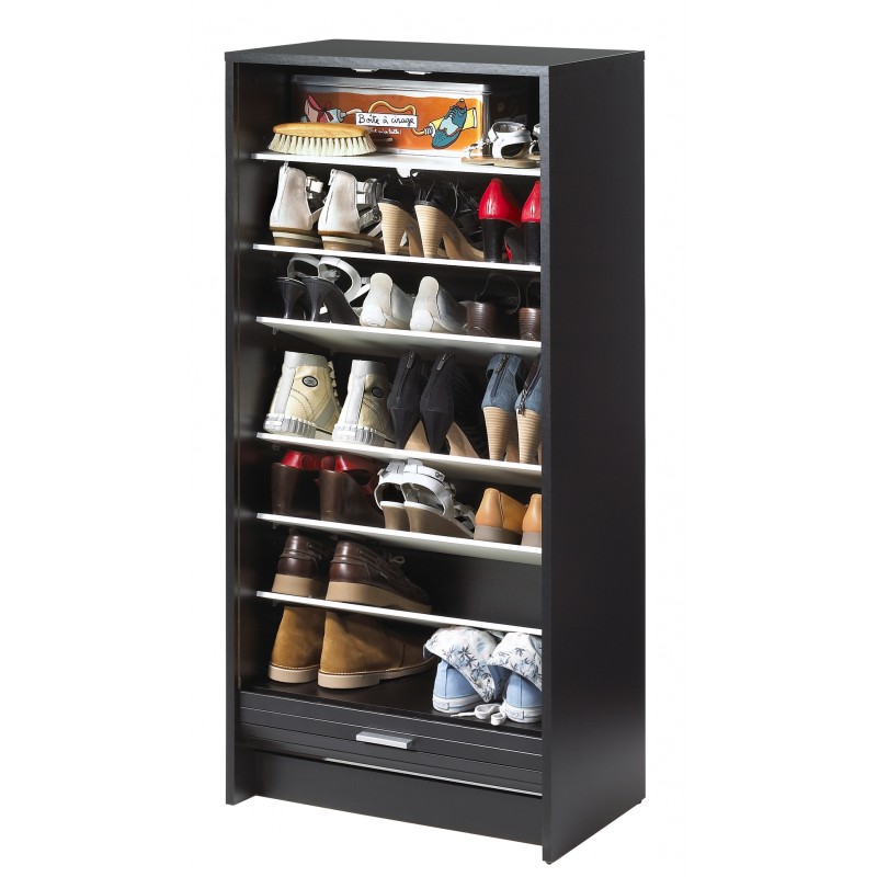 Meuble à Chaussures Noir Bicolore 21 paires. Largeur 58.4 cm x Hauteur 121.6 cm x Profondeur 36.1 cm. Meuble gain de place. 7 Tablettes dont 6 inclinables. Rideau blanc ou imprimé. Meuble Eco-conçu. Fabriqué en France. Livraison sous 7 jours.