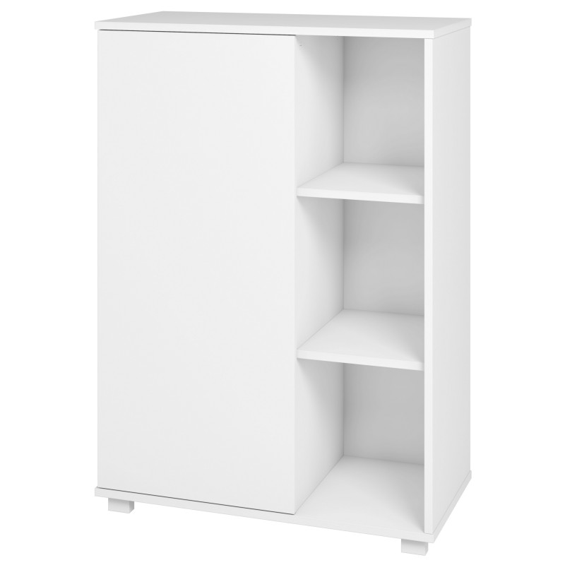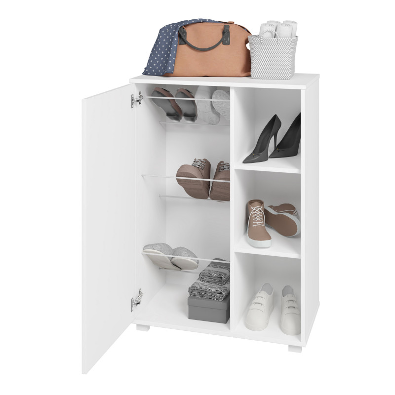 Armoirette - Meuble d'Entrée - Lingère - Meuble à chaussures 9 Paires. 1 Porte. 6 Niches. 2 Tablettes et 3 Paires de Tiges métal Inclinées pour les chaussures. Largeur 67.5 cm Hauteur 96.5 cm Profondeur 35 cm. Coloris Blanc. Livraison sous une semaine offerte.