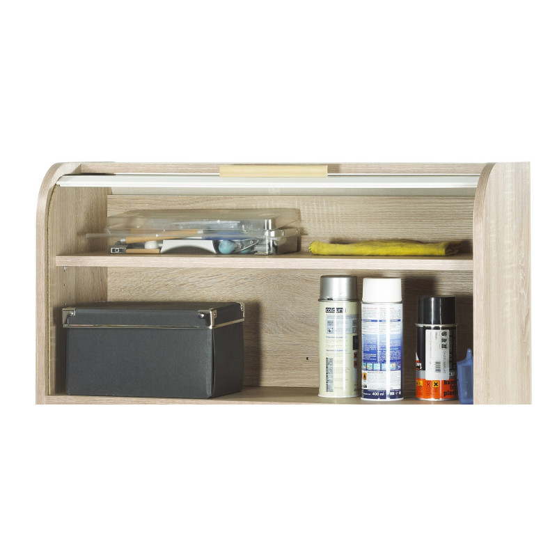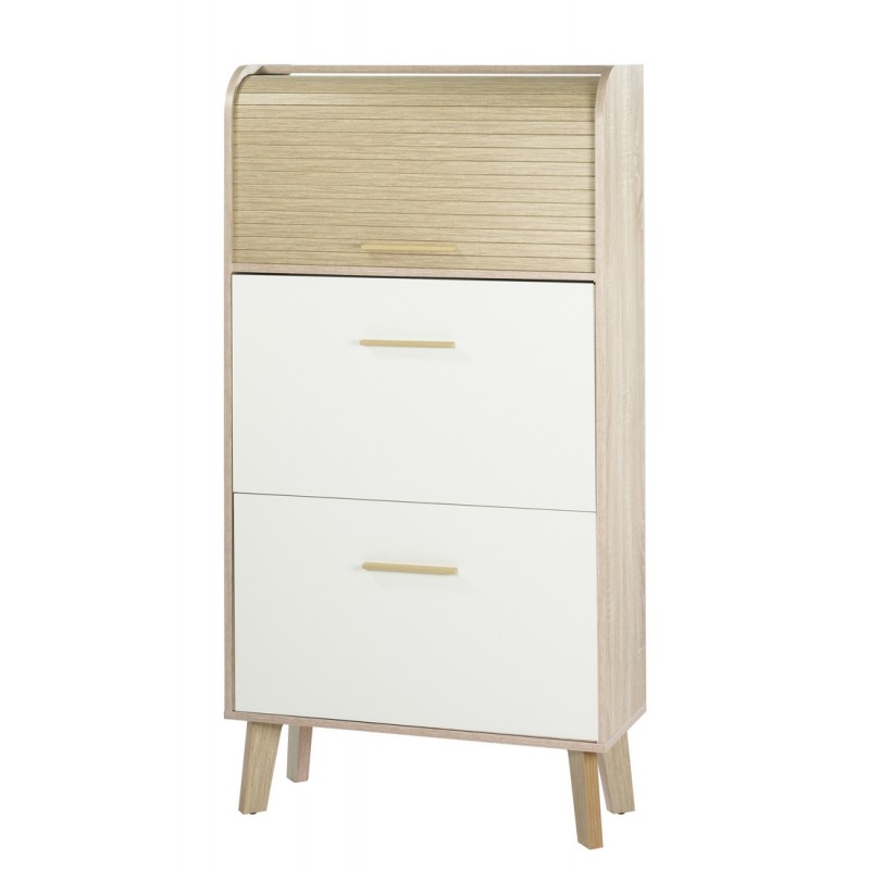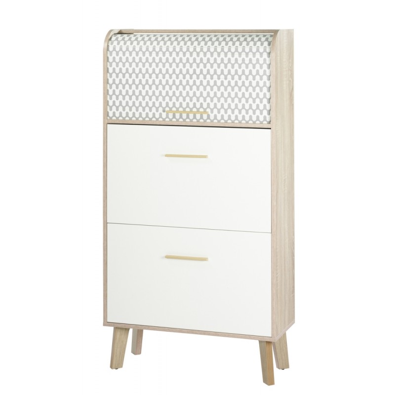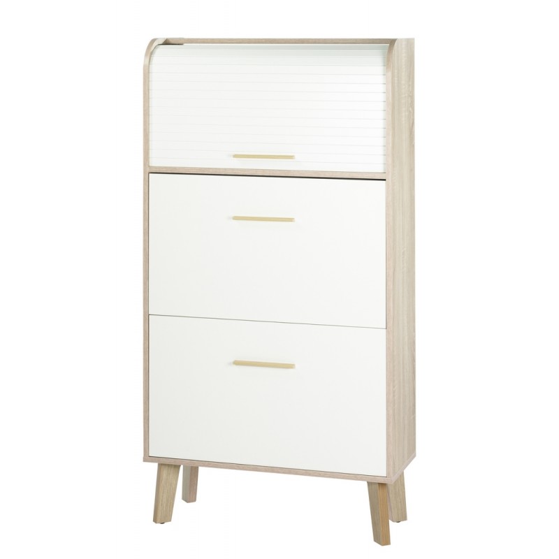 Meuble à Chaussures Chêne Abattants Blancs. 18 paires environ. Coloris du rideau, blanc, chêne ou 'vagues'. Largeur 75.2 cm Hauteur 143.1 cm Profondeur 30.6 cm. Livraison gratuite sous une semaine.