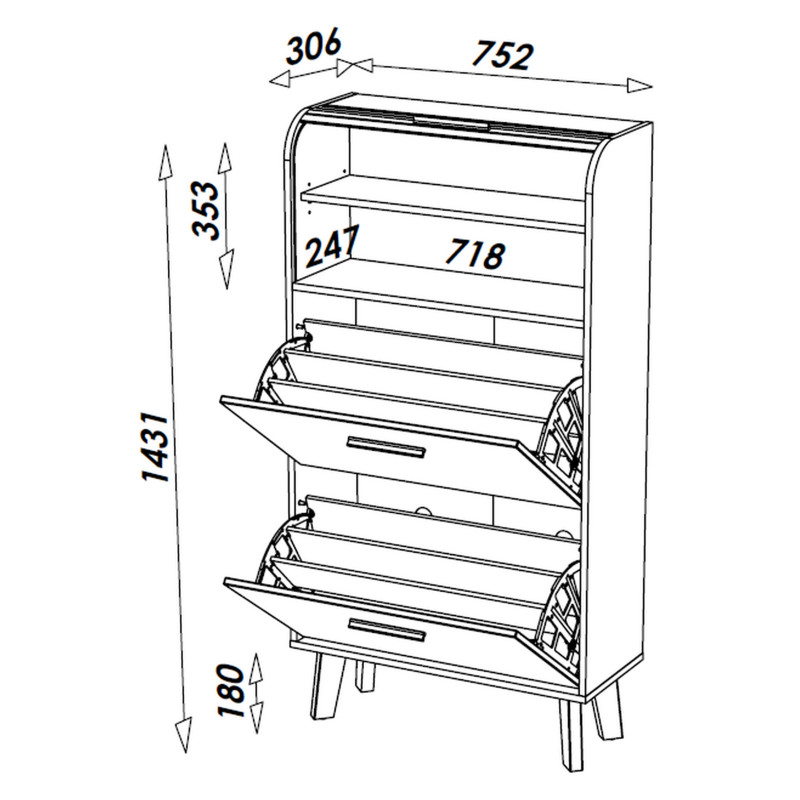 - 2 abattants / 3 rangées de rangement de chaussures par abattant.