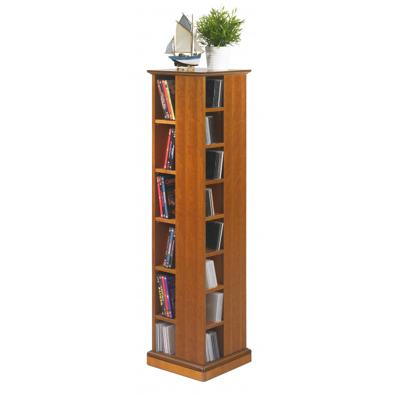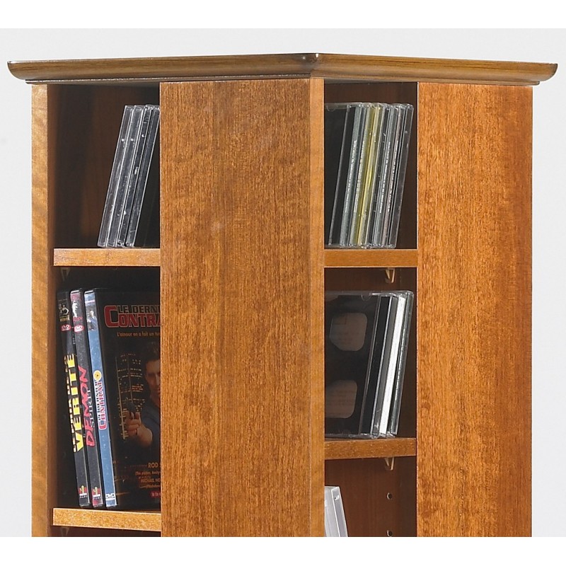 Tour Range CD DVD. Pivotante sur roulettes. 4 faces Ouvertes. Plaquée Merisier. Socle en Aulne Massif teinté Merisier. 350 CD ou 160 DVD. 28 étagères Réglables en hauteur. Largeur 35 cm Hauteur 134.5 cm Profondeur 35 cm Livraison sous une semaine offerte..