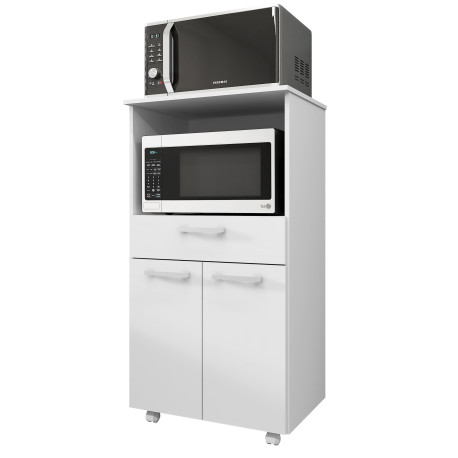 Meuble Micro-Onde DUETTO. 2 Portes, 1 Grand Tiroir et 1 Niche. Sur Roulettes. Coloris Blanc. Largeur 61 cm Hauteur 117.5 cm Profondeur 48.8 cm. Glissières et Charnières métalliques. Livraison gratuite sous une semaine.