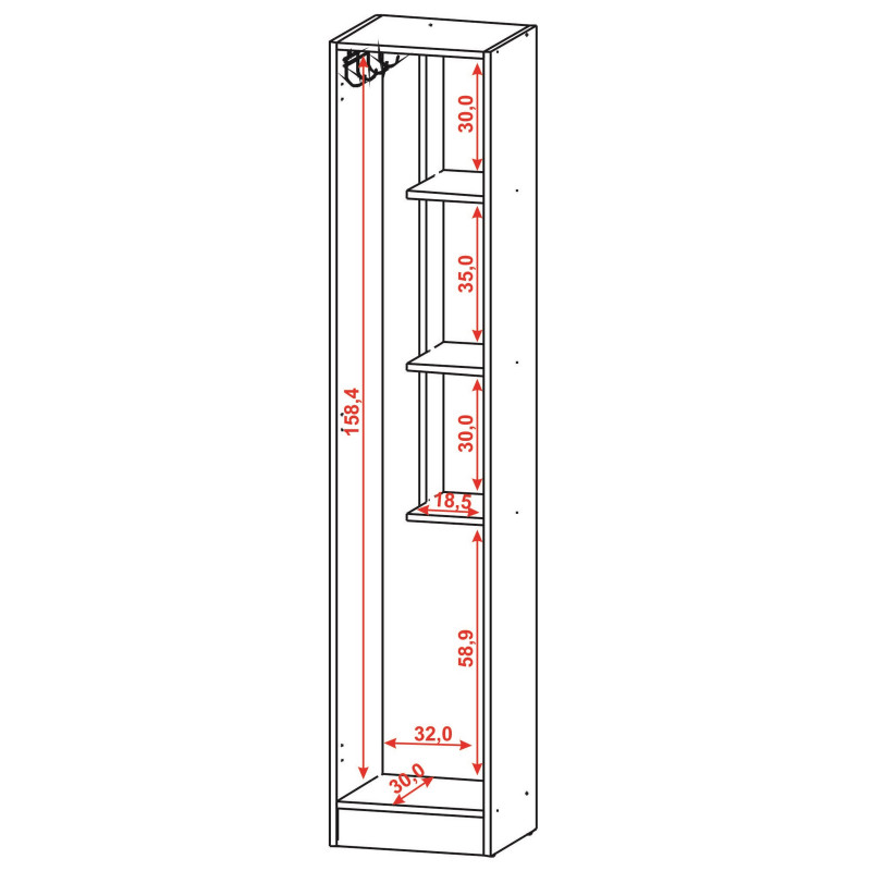 - 1 Espace Balais, Outils,.. à Gauche : Largeur 13.5 cm Hauteur 158.4 cm Profondeur 30 cm