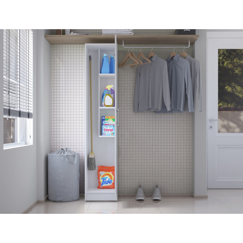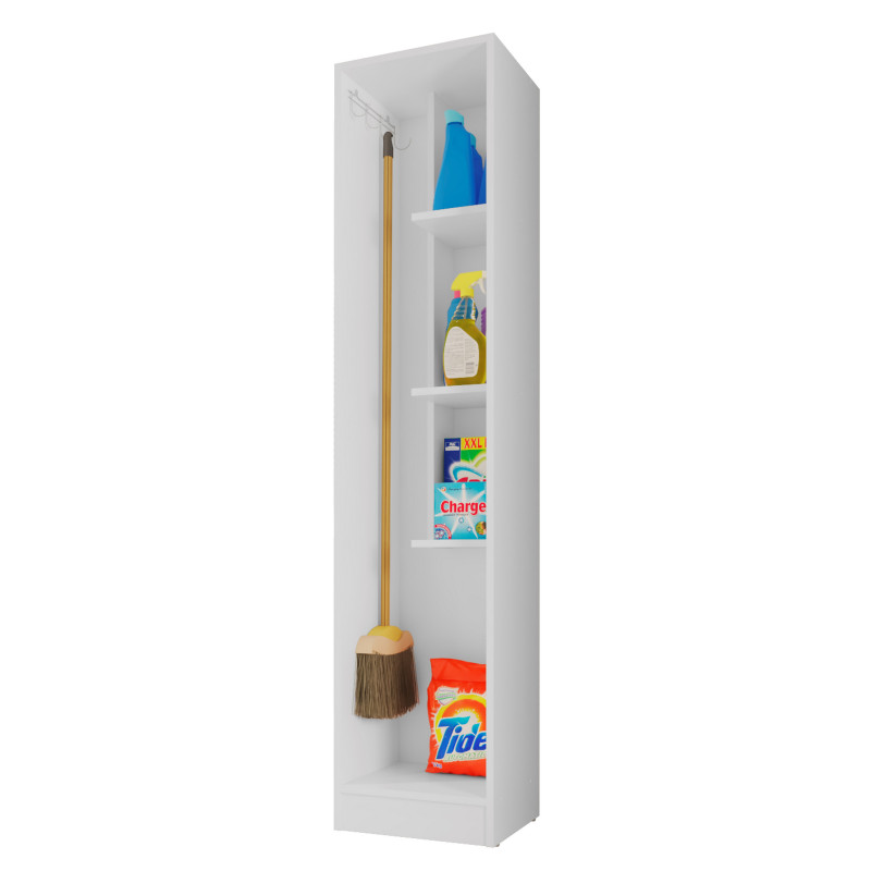 Armoire de Buanderie, Cellier et Garage 1 Porte. Gamme LAVANDE. Coloris Blanc. Largeur 35 cm Hauteur 170 cm Profondeur 31.8 cm. Livrée avec 4 Crochets pour suspendre Balais et Outils. 4 Niches - 3 Etagères. Livraison gratuite sous une semaine.