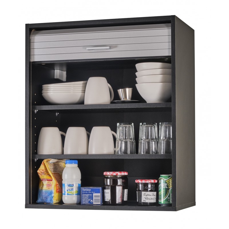 Meuble Elément Haut de Cuisine. Coloris Noir + Rideau Blanc, Chêne ou Alu. Largeur 60 cm Hauteur 72 cm Profondeur 35 cm. 2 Tablettes réglables. Fermeture par 1 Rideau. A suspendre ou à poser. Meuble éco-conçu. Fabriqué en France. Eco-conçu, certifié PEFC. Livraison sous 7 jours offerte.
