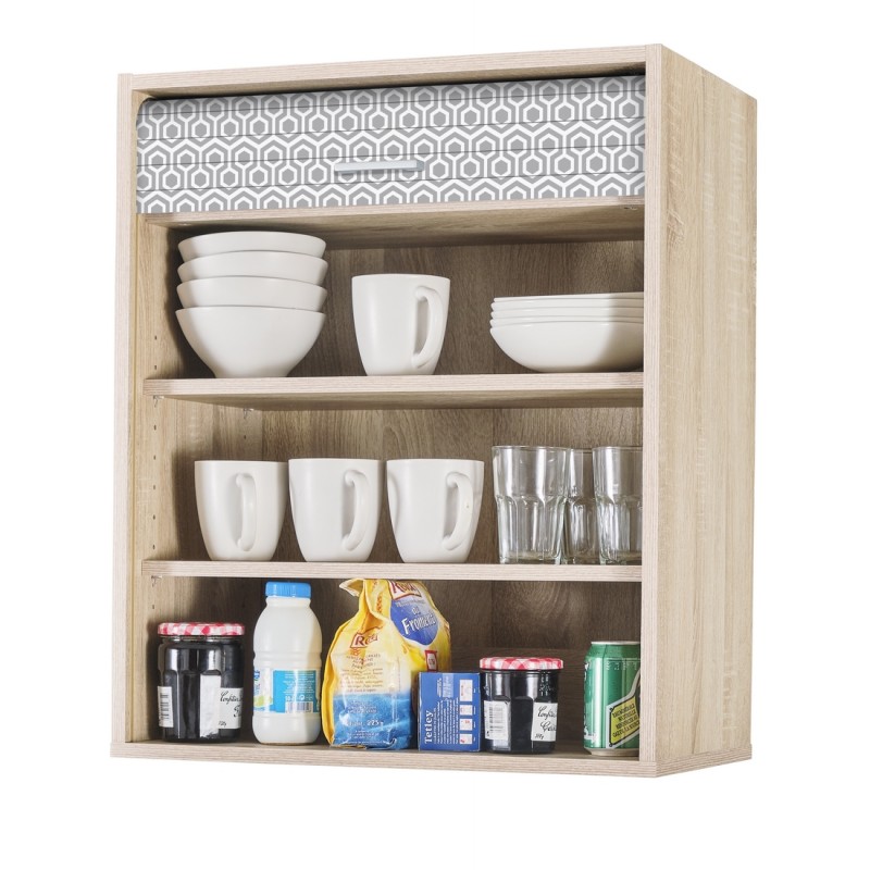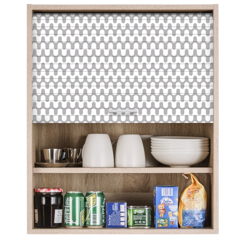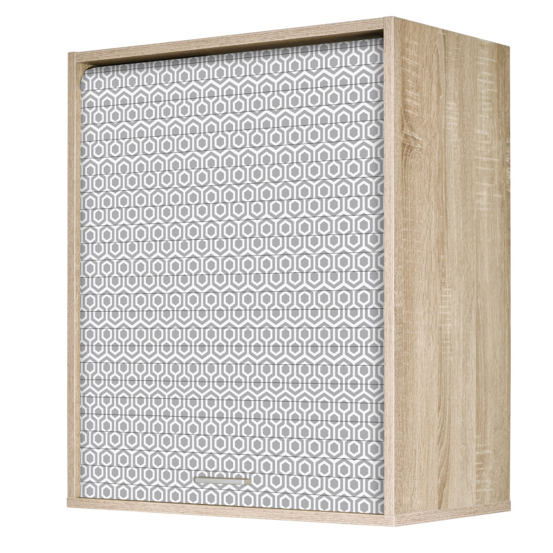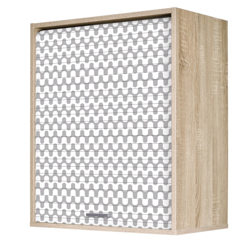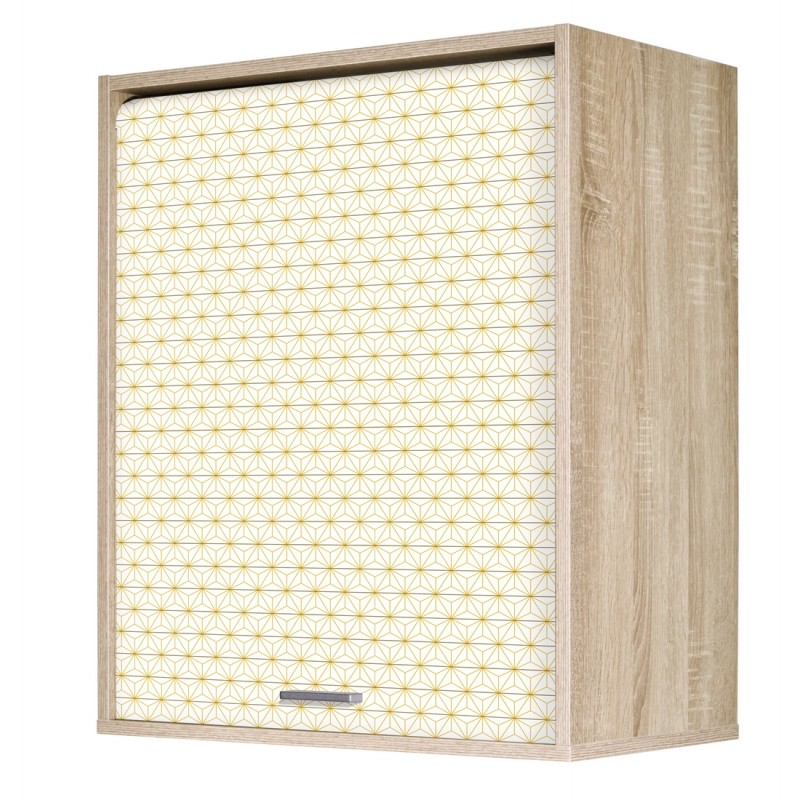 Meuble Elément Haut de Cuisine. Coloris Chêne + Rideau Imprimé (plusieurs motifs). Largeur 60 cm Hauteur 72 cm Profondeur 35 cm. 2 Tablettes. Fermeture par 1 Rideau. A suspendre ou à poser. Meuble éco-conçu. Fabriqué en France. Livraison sous 7 jours offerte.