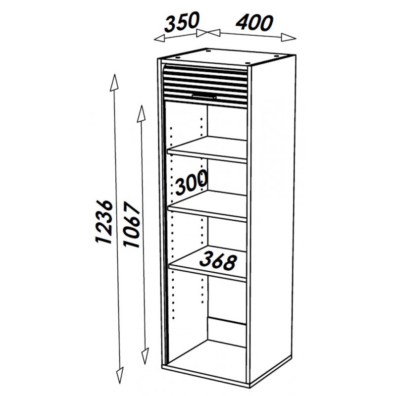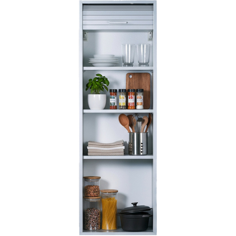 Meuble de Cuisine Haut Coloris Imitation Aluminium. Largeur 40 cm Hauteur 123.6 cm Profondeur 35 cm. 3 Tablettes. 1 Rideau coulissant. A poser ou à suspendre (fixations fournies). Eco-conçu. Certifié PEFC. Fabriqué en France. Livraison sous une semaine offerte.