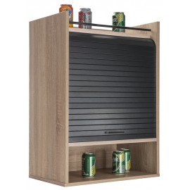 Meuble Haut Elément de Cuisine Imitation Chêne + Rideau Noir. Largeur 40 cm Hauteur 123.6 cm Profondeur 3 cm. 3 Tablettes. A poser ou à fixer au mur. Fabriqué en France. Eco-conçu. Certifié PEFC. Livraison sous une semaine offerte.