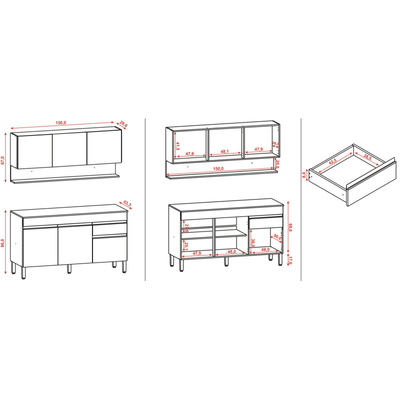 - Dimensions du meuble bas : Largeur 150 cm Hauteur 86 cm Profondeur 53.3 cm