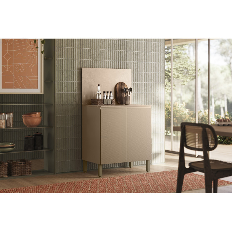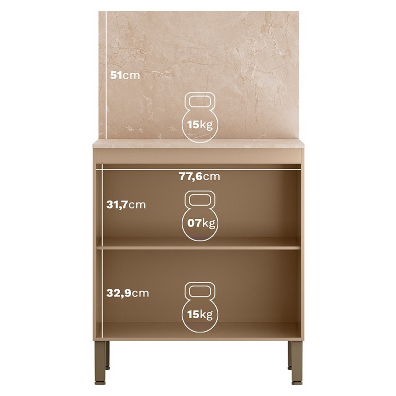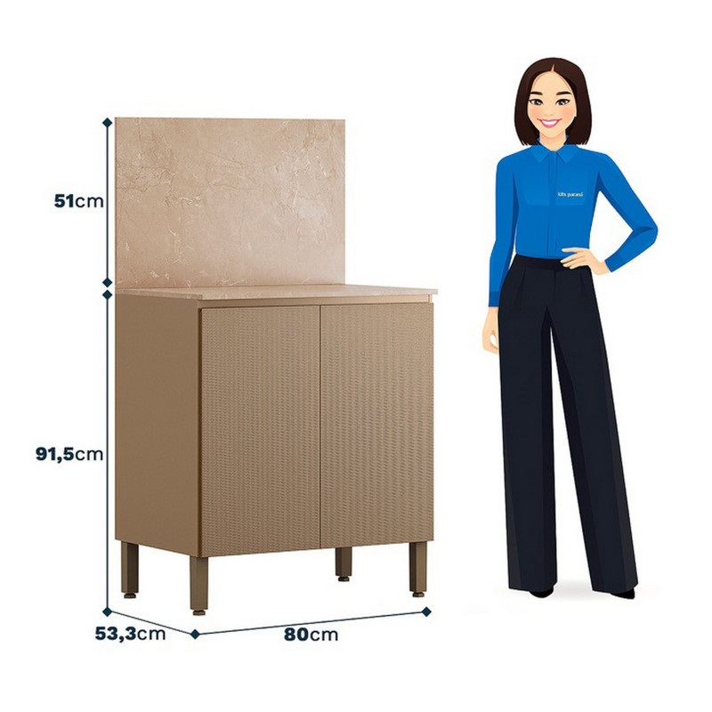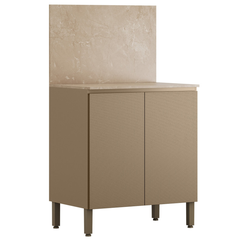 Meuble de Cuisine Bas - Buffet Bas . 2 Portes 1 Etagère 2 Niches. Crédence de protection murale. Coloris : Meuble Taupe Clair, Portes en Relief Gaufré, Dessus et Crédence Imitation Beige Marbré. Longueur 80 cm Hauteur 91.5 cm 142.5 cm avec la crédence Profondeur 53.3 cm. 1 Tablette. Charnières en métal. 4 Pieds Réglables. Livraison gratuite sous une semaine.