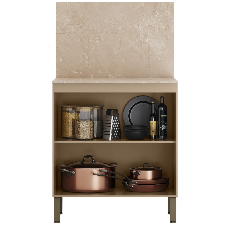 Meuble de Cuisine Bas - Buffet 2 Portes 2 Niches Taupe Clair et Crédence Imitation Beige Marbré L 80 H 91.5 P 53.3 cm