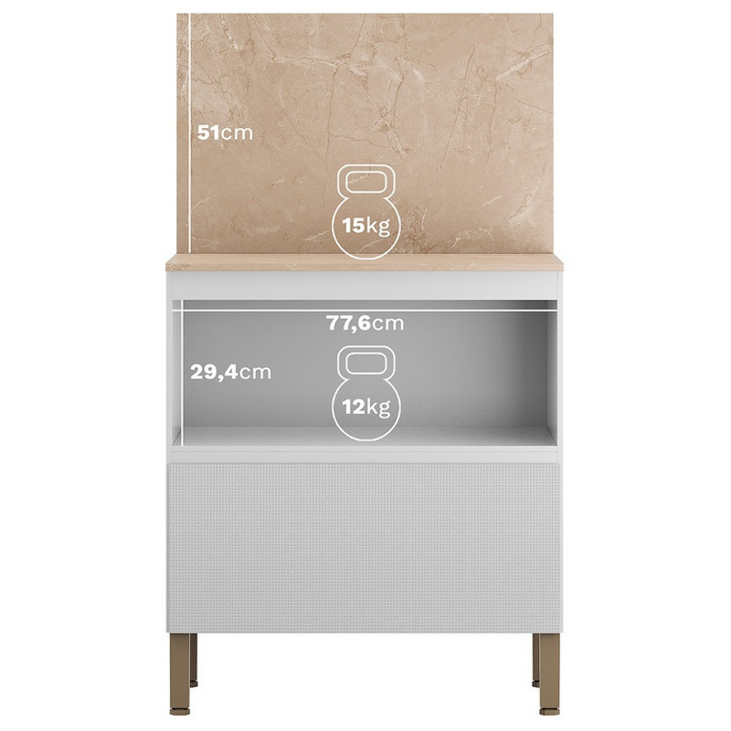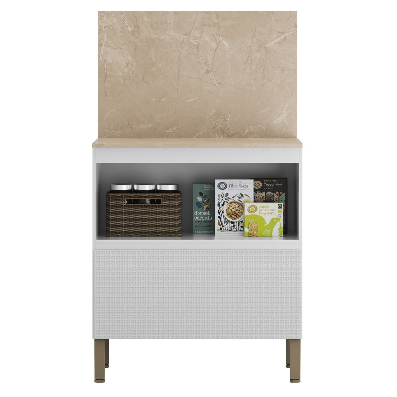 Meuble de Cuisine Bas - Buffet Bas . 1 Porte Abattante 1 Tiroir 1 Niche. Crédence de protection murale. Coloris : Meuble Blanc, Porte Abattante et Façade de Tiroir Blancs en Relief Gaufré, Dessus et Crédence Imitation Beige Marbré. Longueur 80 cm Hauteur 91.5 cm 142.5 cm avec la crédence Profondeur 53.3 cm. Charnières et coulisses en métal. 4 Pieds Réglables. Livraison gratuite sous une semaine.