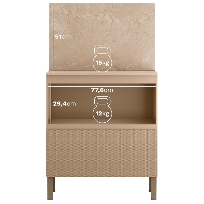Meuble de Cuisine Bas - Buffet Bas . 1 Porte Abattante 1 Tiroir 1 Niche. Crédence de protection murale. Coloris : Meuble Taupe Clair, Porte Abattante et Façade de Tiroir en Relief Gaufré, Dessus et Crédence Imitation Beige Marbré. Longueur 80 cm Hauteur 91.5 cm 142.5 cm avec la crédence Profondeur 53.3 cm. Charnières et coulisses en métal. 4 Pieds Réglables. Livraison gratuite sous une semaine.