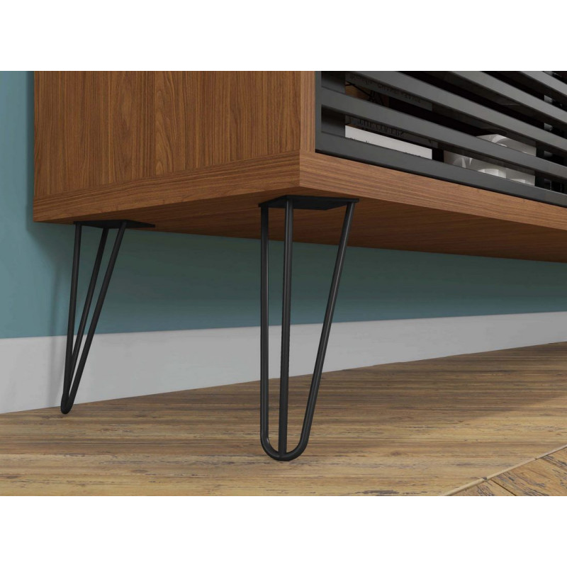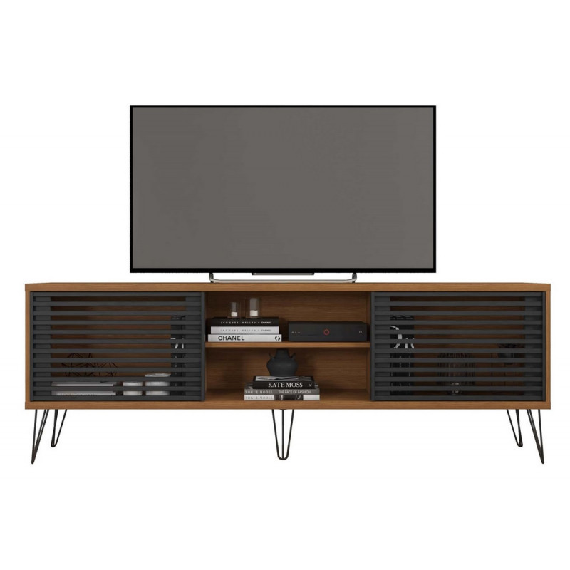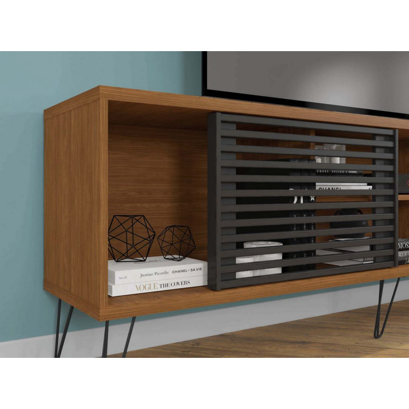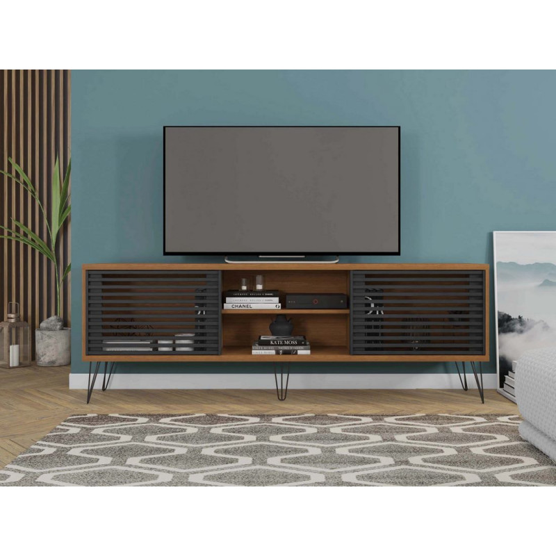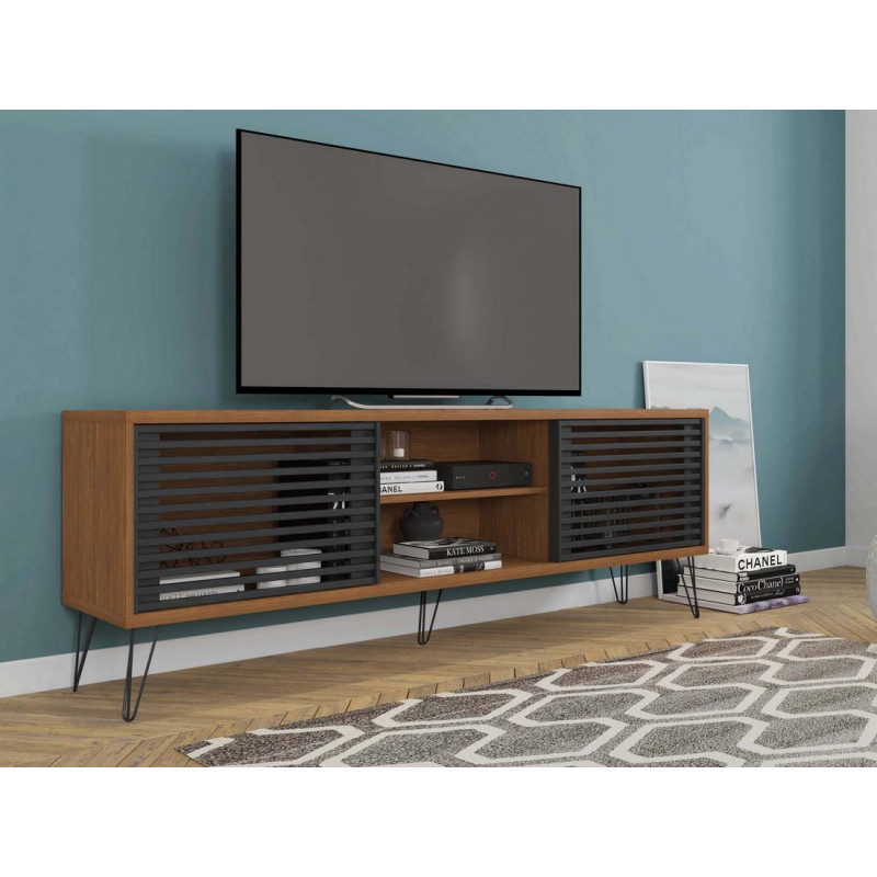 Meuble TV 180 cm pour TV 72 pouces Maxi. 2 Portes Coulissantes Style Persienne. Pieds Métal. Coloris Imitation Chêne et Noir