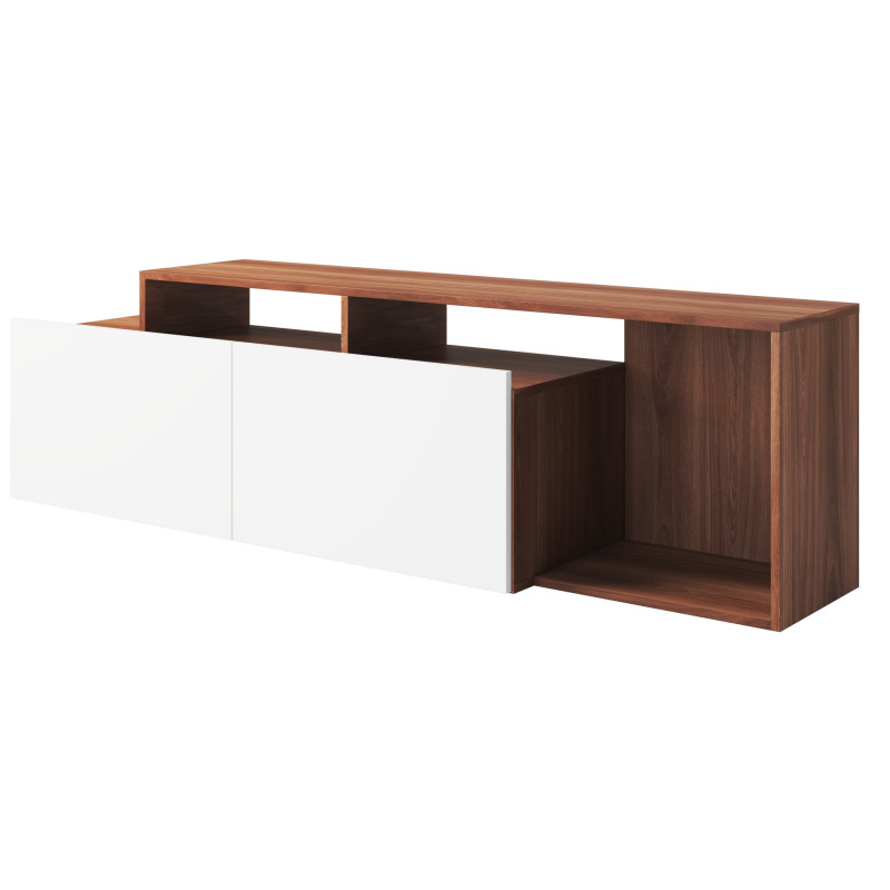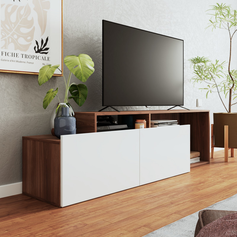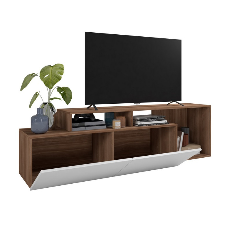 Meuble TV 50 Pouces Maxi 2 portes abattantes 6 Niches Blanc et imitation Châtaignier
