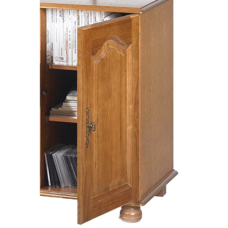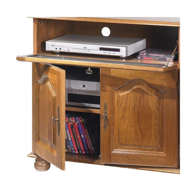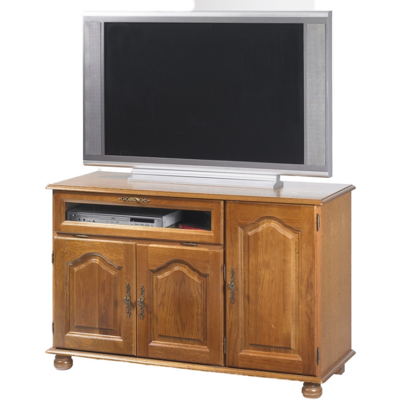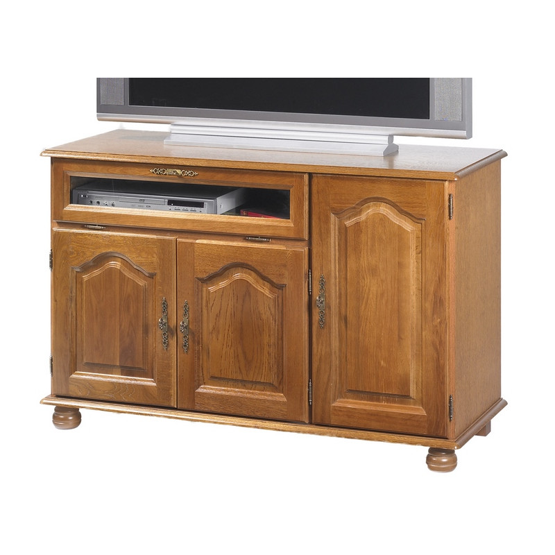Meuble TV Hifi Chêne Rustique. Pour TV 55 pouces maxi. 3 Portes Chêne Massif. 1 Abattant Vitré. 3 Etagères réglables. 6 Niches. Longueur 120.6 cm Hauteur 77 cm Profondeur 46,5 cm. 2 Pieds Boule + 3 Pieds carrés Hëtre Teintés Chêne. Livraison sous une semaine offerte.