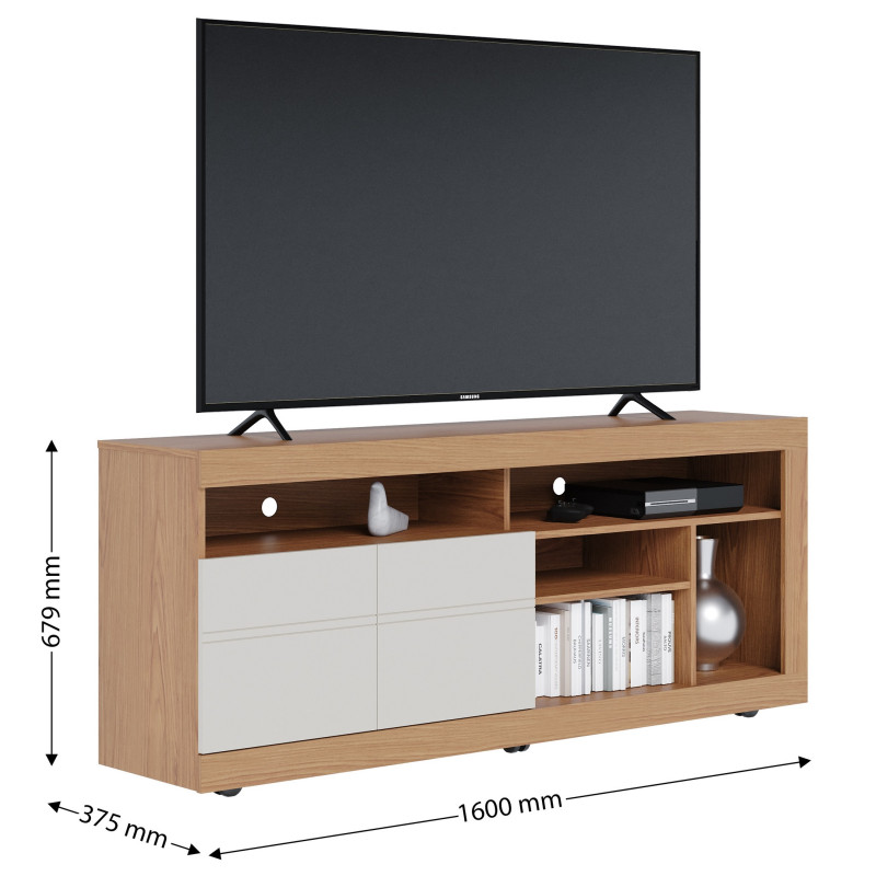 Meuble TV 65 Pouces YARA. Coloris Imitation Chêne + Blanc Ecru. 2 Portes décorées. 6 Niches. 6 Roulettes. Longueur 160 cm Hauteur 68 cm Profondeur 37.4 cm Livraison gratuite sous une semaine.