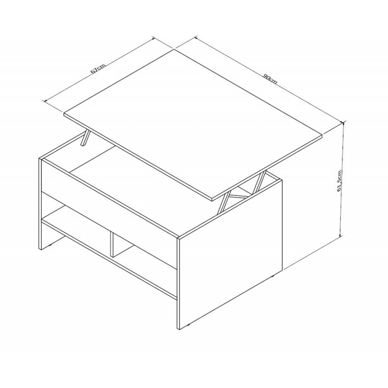 Table basse de Salon avec Plateau Relevable. 1 Grand Rangement sous le Plateau. 2 Niches en dessous. Coloris Blanc. Longueur 90 cm Hauteur 49.5 et 61.5 cm Profondeur 67 cm. Livraison sous une semaine offerte.