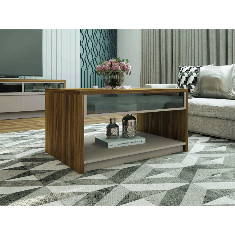 Table Basse Rectangle Vitrée. 1 Niche. Coloris Chêne + Gris Taupe