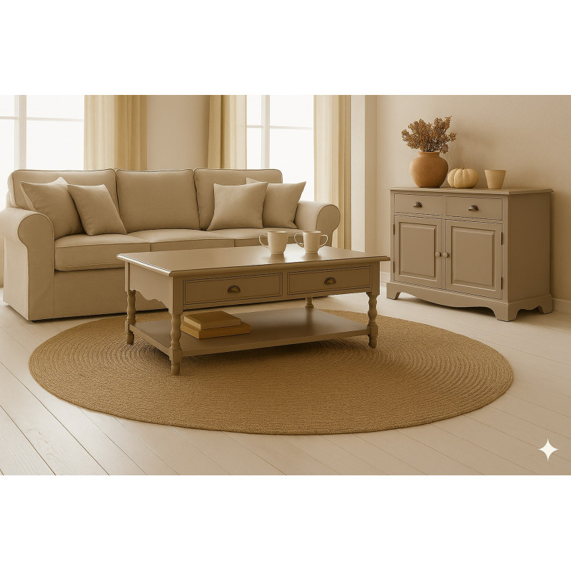 Table Basse Rectangle. Coloris Taupe. 2 Tiroirs Va-et-Vient accessibles des 2 côtés. Style Anglais Charme. Largeur 100 cm Hauteur 38 cm Profondeur 70 cm. Livraison sous une semaine offerte.