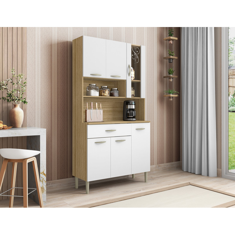 Buffet de Cuisine. 5 Portes, 1 Porte Vitrée (sérigraphiée) et 1 Grand Tiroir. GOLDEN. Coloris Imitation Chêne + Façade Blanc Structuré. Largeur 90.9 cm Hauteur 173.5 cm Profondeur 36.3 cm. 7 Niches. Glissières et Charnières métalliques. Livraison gratuite sous une semaine.