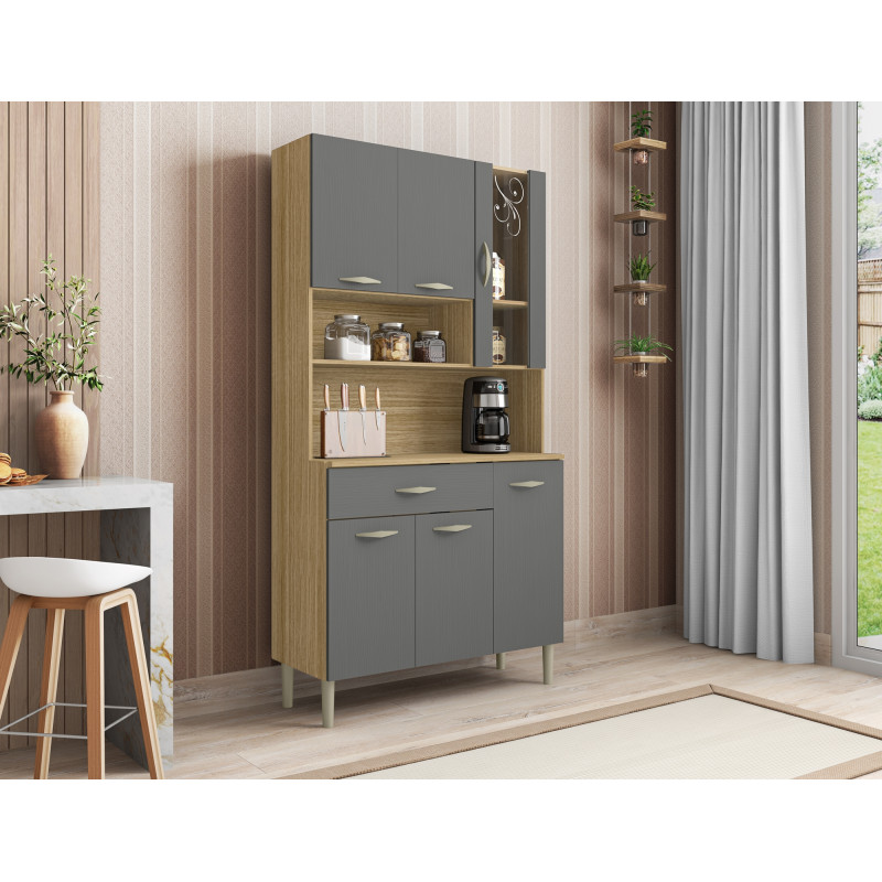 Buffet de Cuisine. 5 Portes, 1 Porte Vitrée (sérigraphiée) et 1 Grand Tiroir. GOLDEN. Coloris Imitation Chêne + Façade Gris Structuré. Largeur 90.9 cm Hauteur 173.5 cm Profondeur 36.3 cm. 7 Niches. Glissières et Charnières métalliques. Livraison gratuite sous une semaine.