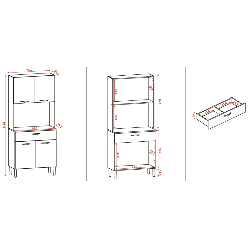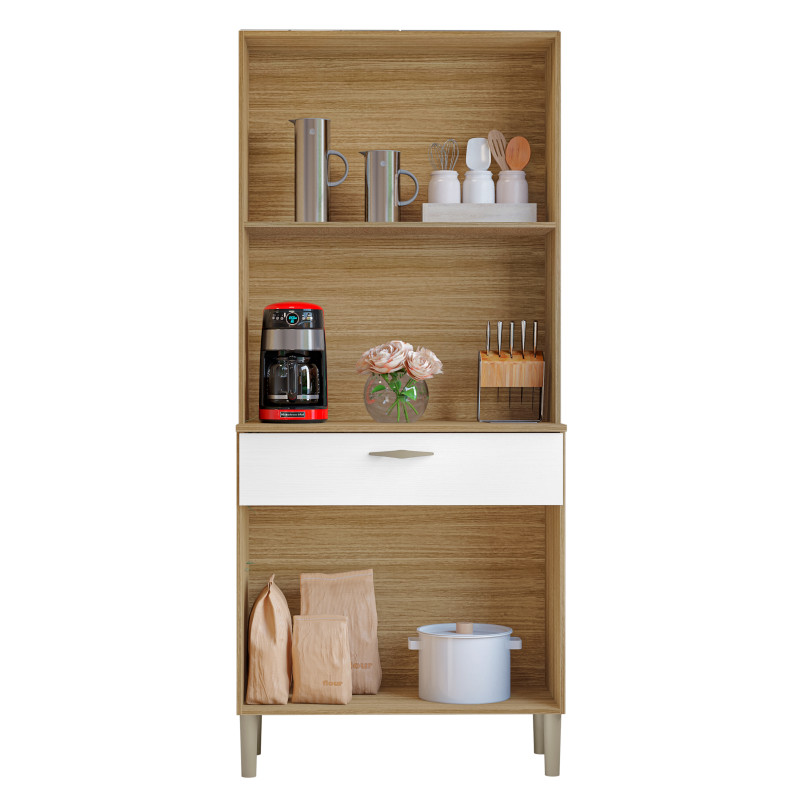 Buffet de Cuisine. 4 Portes et 1 Grand Tiroir. CRIS. Coloris Imitation Chêne + Façade Blanc Structuré. Largeur 74.5 cm Hauteur 170.5 cm Profondeur 36.3 cm. 3 Niches. Glissières et Charnières métalliques. Livraison gratuite sous une semaine.