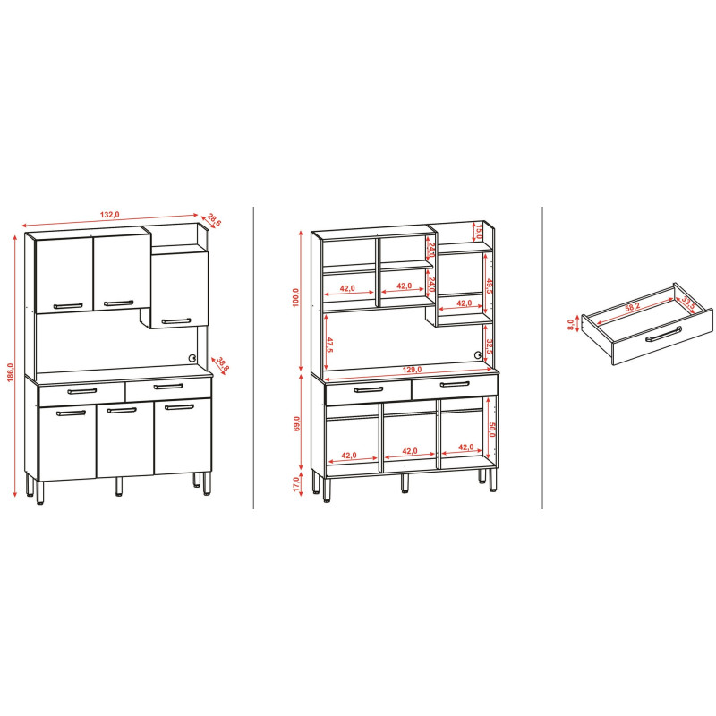 Buffet de Cuisine. 6 Portes Pleines et 2 Tiroirs. MODENA. Coloris Imitation Chêne + Façade Taupe. Longueur 132 cm Hauteur 186 cm Profondeur 38.8 cm. 10 Niches, 2 Tablettes. 5 Pieds. Glissières et Charnières métalliques. Livraison gratuite sous une semaine.