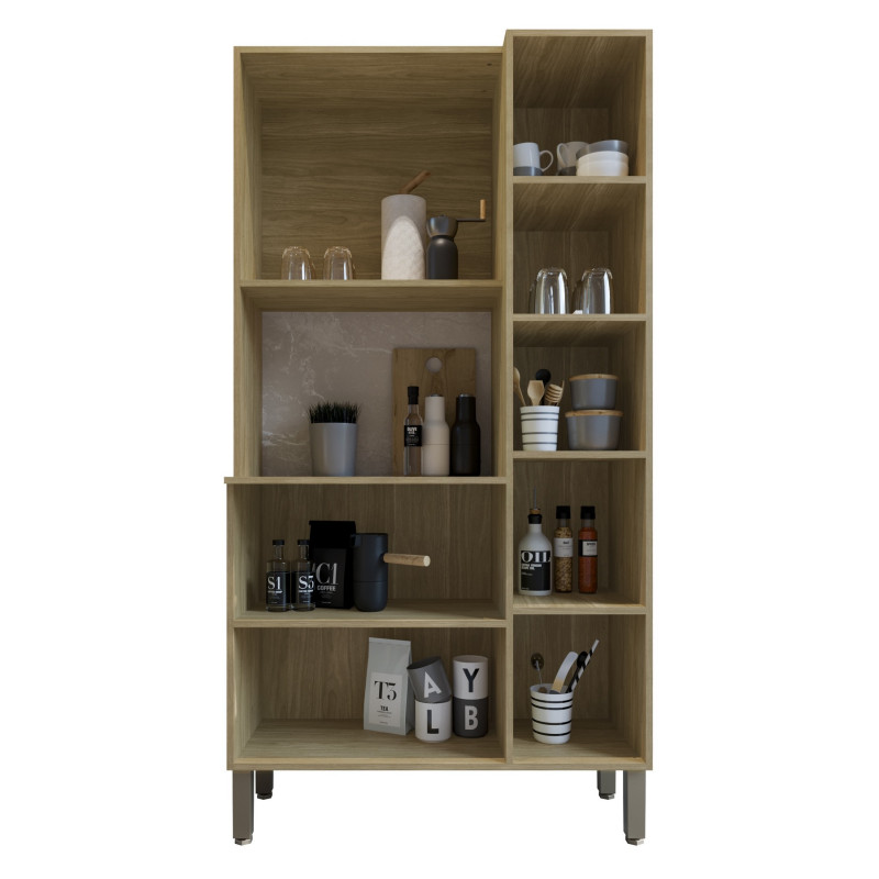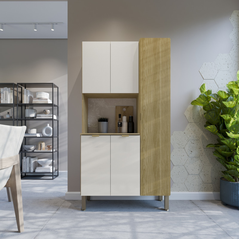 Buffet de Cuisine. Meuble Multifonctions (armoire de rangement, meuble de salle de bains,...). 5 Portes. 9 Niches. Modèle MELISSA. Coloris Imitation Chêne + Blanc Ecru en relief "gaufré". Arrière imitation Marbre. Longueur 91.5 cm Hauteur 176 cm Profondeur 36.3 cm. 5 Tablettes. Charnières métal. Niche percée pour le passage des câbles. 4 Pieds Réglables. Livraison gratuite sous une semaine.