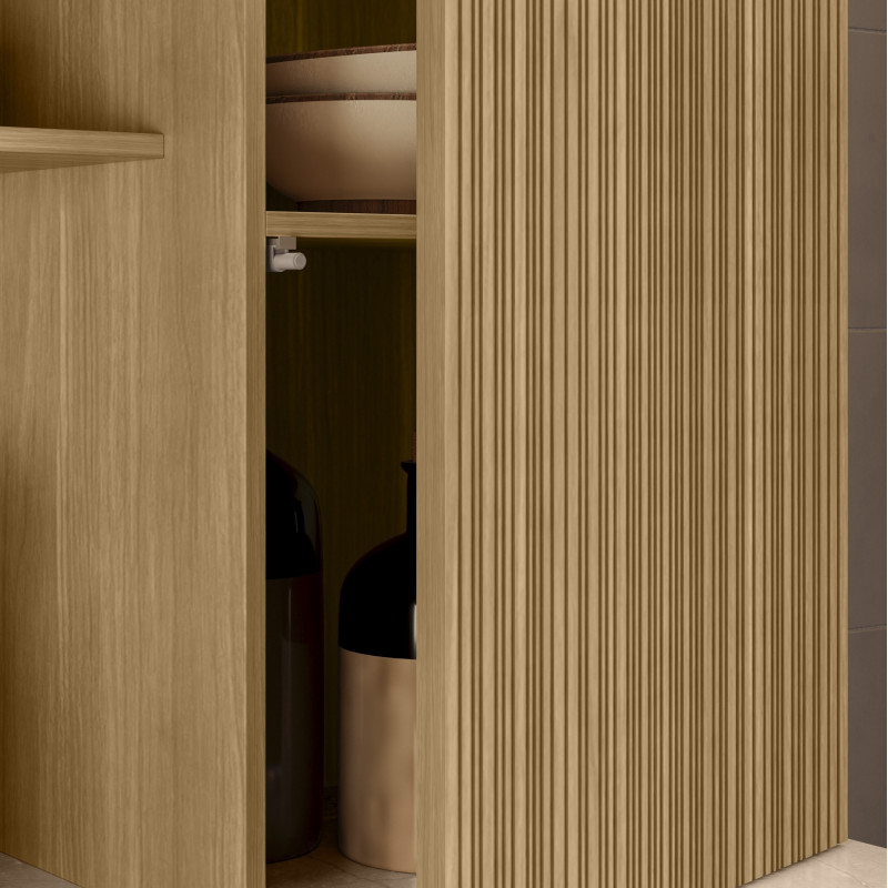 Buffet de Cuisine. 8 Portes 1 Tiroir 18 Niches. Modèle SLOW. Coloris Imitation Chêne Structuré + Gris Taupe en relief "gaufré". Longueur 160 cm Hauteur 200 cm Profondeur 38.8 cm. 9 Tablettes. Charnières et coulisses de tiroir en métal. 6 Pieds Réglables. Livraison gratuite sous une semaine.